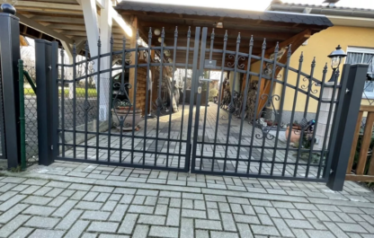 Dieses hochwertige Einfahrtstor verbindet zeitloses Design in geschmiedeter Optik mit langlebiger Funktionalität. Es ist neu, feuerverzinkt und pulverbeschichtet und bietet zuverlässigen Schutz für Ihre Einfahrt.